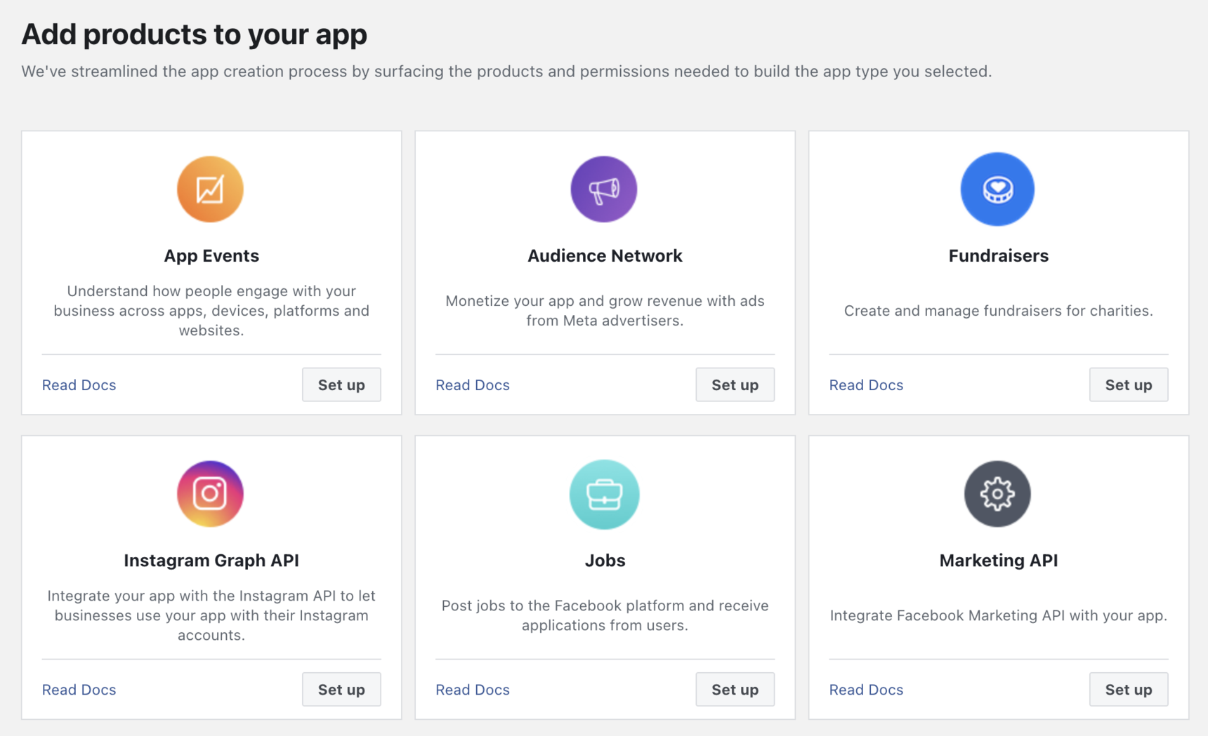 - You will arrive at a view like this. Add the Marketing API product by clicking "Set up."