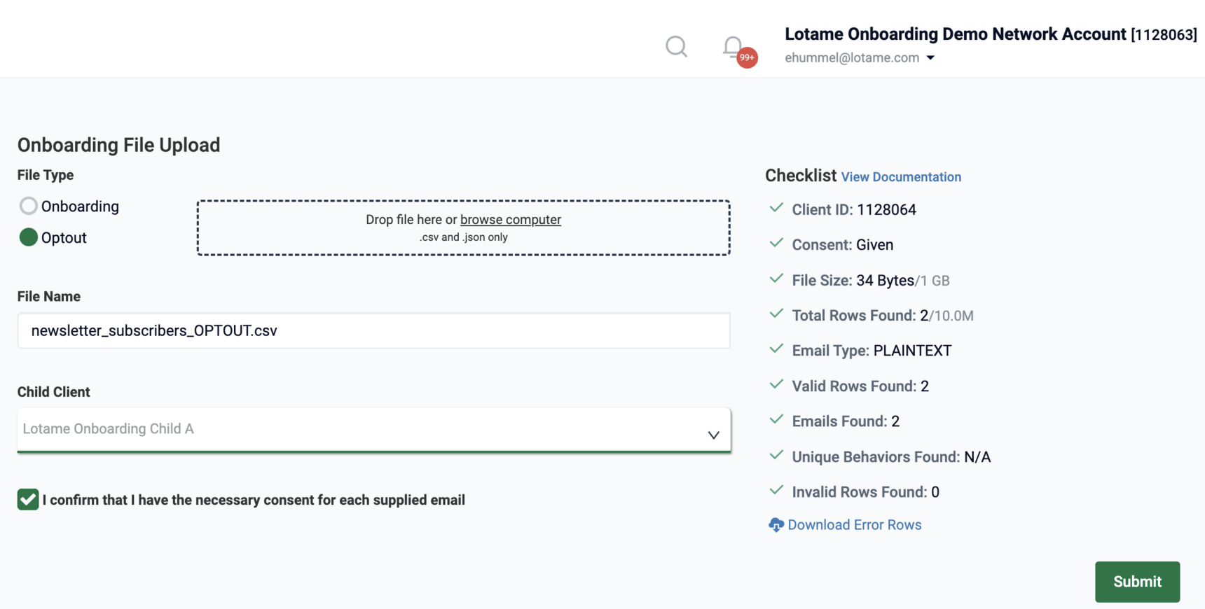 Select Onboarding as the File type, add your file, select the Child Account to upload to, provide consent, and select Submit. Note that the checklist on the right will validate your file so you know what you uploaded will load correctly.